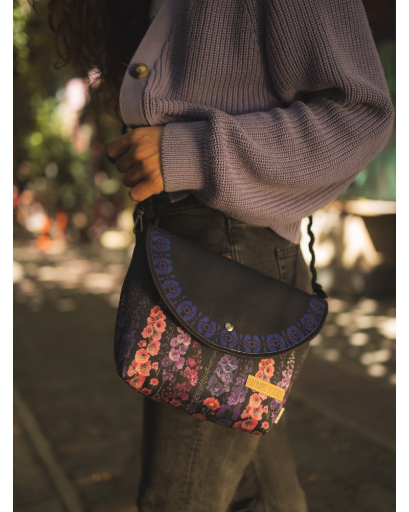 Πολύ ελαφριά τσάντα σε μικρό μέγεθος που κλείνει με κούμπωμα, έχει έναν χώρο, είναι φοδραρισμένο και συνοδεύεται από το λουράκι του το οποίο είναι από γιούτα. Είναι κατασκευασμένη από υδρόφοβο, ψηφιακά εκτυπωμένο ύφασμα, το οποίο σχεδιάζεται από την Lazydayz!