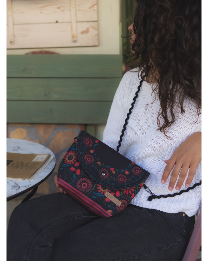 Πολύ ελαφριά τσάντα σε μικρό μέγεθος που κλείνει με κούμπωμα, έχει έναν χώρο, είναι φοδραρισμένο και συνοδεύεται από το λουράκι του το οποίο είναι από γιούτα. Είναι κατασκευασμένη από υδρόφοβο, ψηφιακά εκτυπωμένο ύφασμα, το οποίο σχεδιάζεται από την Lazydayz!