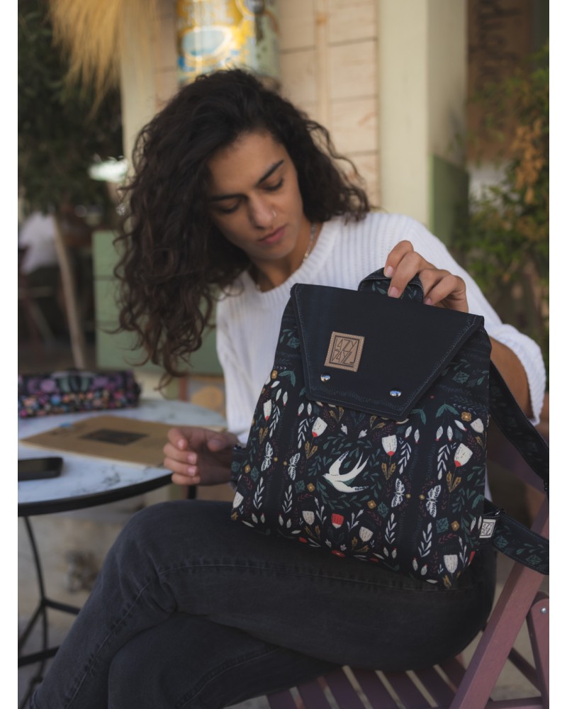 One of our bestsellers, the Nephele Sparrow backpack is a small bag, yet it offers enough space for all the essentials you need on your outings. Make a statement with this backpack, as its designs are unique and original—different on each side, even on the interior of the flap!