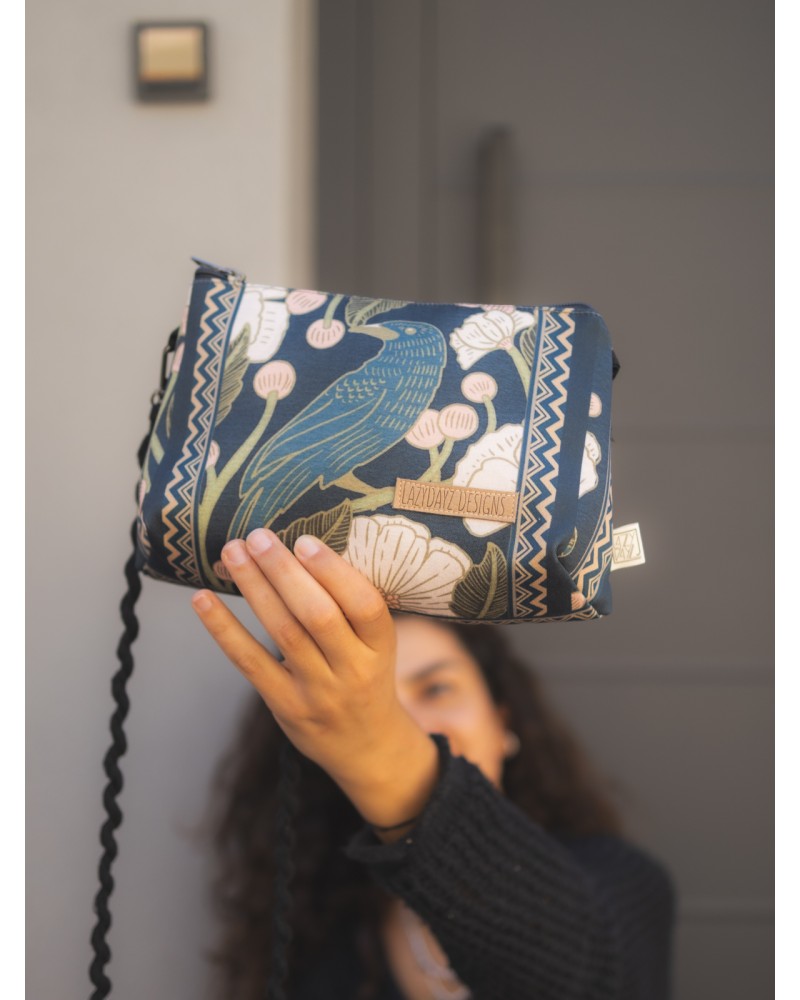 Very light bag in a small size that closes with a zipper, has a compartment, is lined and comes with its strap which is made of jute. It's made from hydrophobic, digitally printed fabric designed by Lazydayz!